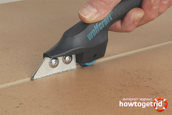 Les bords des carreaux de céramique sont scellés avec du ruban adhésif. Prenez un couteau en papier ou un classeur à carreaux. Un autre outil avec une lame fine et tranchante fera l'affaire. La pointe du couteau est réalisée au centre de la couture. Ils essaient de pousser l'outil aussi profondément que possible pour qu'il atteigne la base en béton.