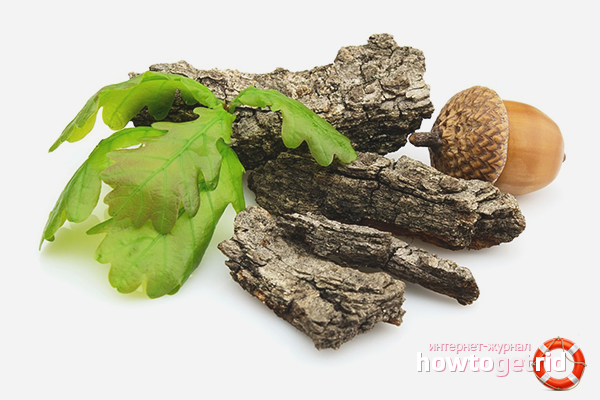 - Écorce de chêne. Il y a beaucoup de tanins dans l'écorce de chêne qui arrêtent la circulation sanguine et régénèrent les tissus endommagés. L'écorce de chêne doit être pré-hachée et versée avec de l'eau bouillante dans un thermos. Laisser toute la nuit.Le matin, un bouillon chaud doit être filtré et rincé à la bouche deux fois par jour.