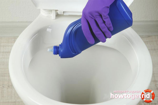 Après 40-45 minutes, vous devrez verser de l'eau. La toilette doit être soigneusement rincée de sorte que le colmatage restant avec de l'acide pénètre dans les égouts. Ensuite, il est conseillé de mettre les membres du ménage autour du cou afin qu'ils ne jettent pas de déchets dans les toilettes.