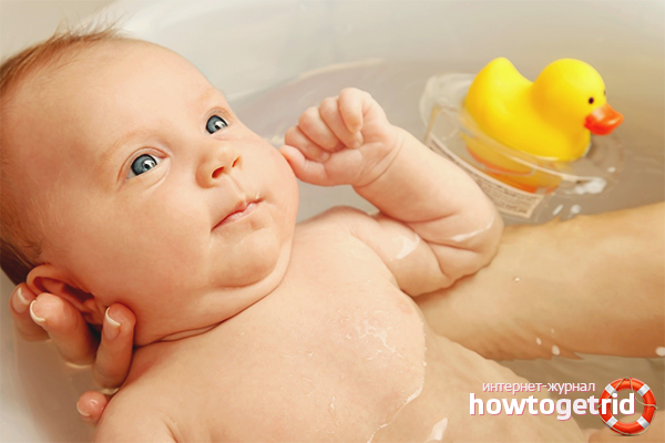 Vous devez commencer à baigner votre enfant avec de courtes périodes de temps. Enveloppez le bébé dans une couche et abaissez-le dans le bain - des jambes au milieu de la poitrine. Le premier bain n'a pas besoin d'être accompagné de savon et d'un gant de toilette - il suffit de rincer le bébé. Le bain est très bénéfique pour le bébé - il agit sur la peau et améliore la circulation sanguine. Après les procédures à l'eau, traitez le cordon ombilical et laissez-le bien sécher. Après la guérison du nombril, l'eau de baignade ne peut pas être bouillie.