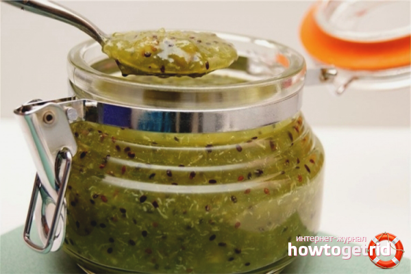 - Libérez le kiwi de la peau, trempez la chair dans l'eau froide et laissez sécher. Hachez ensuite en cubes de 1 * 1 cm, lavez les groseilles à maquereau, débarrassez-vous des queues.