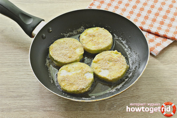 - Commençons donc par les activités préparatoires. Le légume doit être rincé, retiré des pointes et coupé en une épaisseur d'environ 1 cm. Ensuite, vous obtiendrez des tasses qui doivent être écrasées avec de la farine avec grand soin. Pendant que vous désossez, versez l'huile dans la poêle et laissez-la siffler.