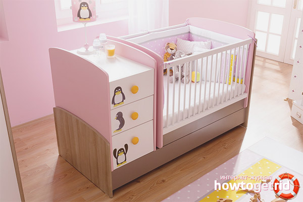 - Ce type de lit d'enfant est une conception unique. À partir de l'attribut, vous pouvez créer une couchette à part entière ou le meuble correspondant. Par exemple, une table à langer ou une commode bien rangée peut être dépliée hors du berceau.