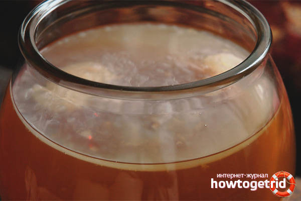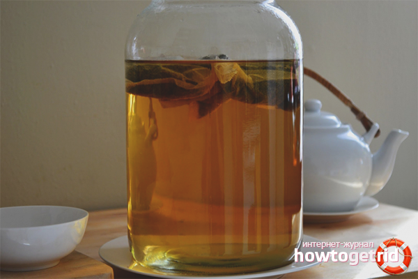 Le schéma de préparation est standard et choisissez la collection à base de plantes en fonction de votre maladie. 200 grammes d'herbes versent 3 litres d'eau bouillante et laissent toute la nuit. Ajouter un peu de miel à l'infusion et y déposer le champignon. Une semaine plus tard, vous obtenez une infusion de thé. Ainsi, vous pouvez préparer une boisson tonique à base d'hibiscus.