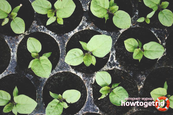Dans les cellules recouvertes de terre, mettez 1 graine. Couche supérieure de terre d'une épaisseur de 0,5 cm, recouverte de verre épais et sur le rebord de la fenêtre.