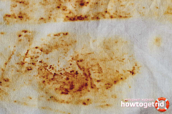 Si des taches sont apparues en raison du séchage sur des tuyaux rouillés, du jus de citron fraîchement pressé est frotté sur les taches. La zone humide est séchée avec un sèche-cheveux. Rincer à l'eau ou laver avec de la poudre n'est pas nécessaire. Les agrumes illuminent parfaitement les taches brunâtres et le tissu javellisant.