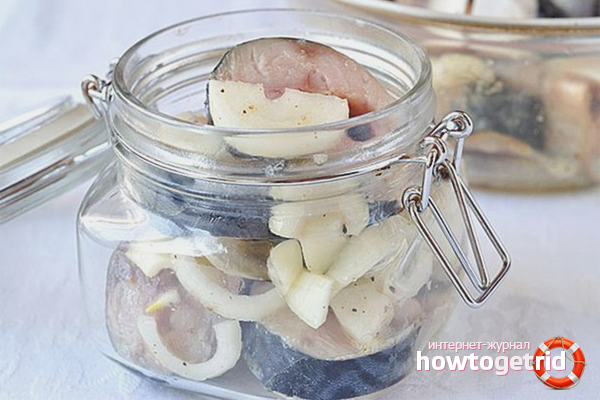 - Placez le maquereau dans un bocal ou un récipient avec un couvercle, vous pouvez pré-couper le poisson en morceaux. Verser le produit avec de la saumure tiède, du liège et réfrigérer pendant trois jours.
