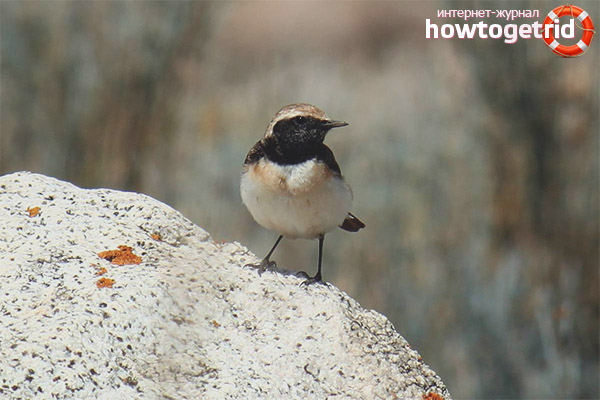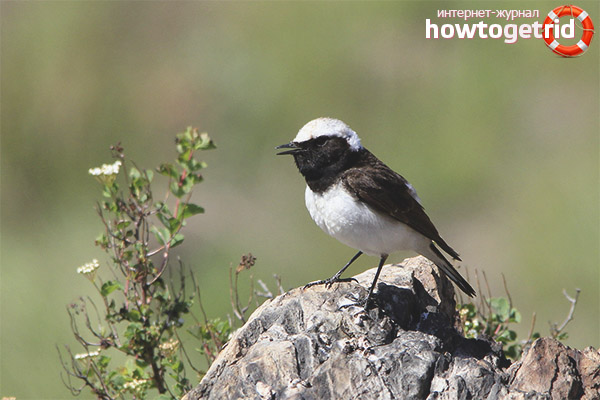 Mais après l'apparition des poussins, il participe activement à leur alimentation. La femelle et le mâle prennent soin des enfants ensemble, ne se cédant pas à l'agilité. Selon les observations, le Kamenka à tête chauve pond des œufs une seule fois pendant l'été. Les oiseaux se nourrissent de toutes sortes d'insectes et ne refusent pas la végétation. Ils aiment toutes sortes de baies, et si quelque part un jardin ou un champ avec des fraises, c'est parfait pour eux.