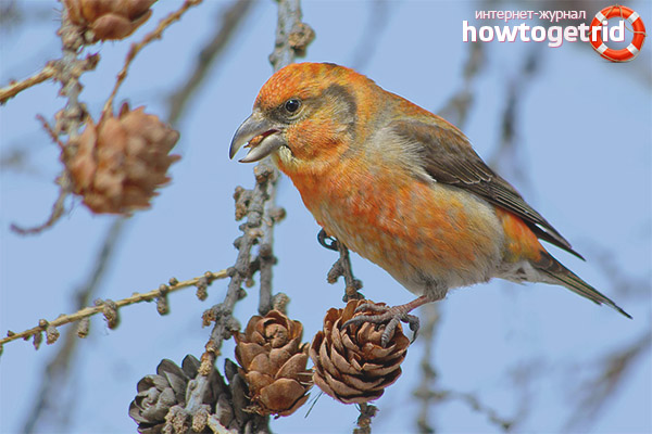 - Le principal produit de l'alimentation des individus considérés est le cône d'épinette. En raison de la forme particulière du bec, ces oiseaux enlèvent les flocons des cônes sans aucun problème. Ensuite, les graines picorent les graines. Il convient de noter que littéralement quelques grains lui suffisent pour manger des oiseaux.