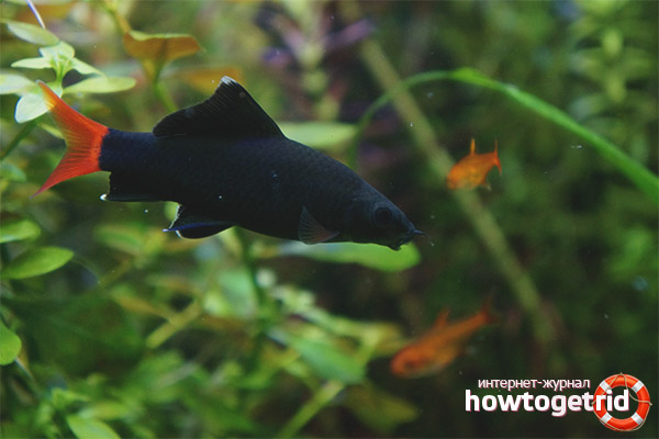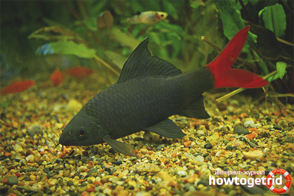 - Quand une personne voit un labe pour la première fois, elle tombe instantanément amoureuse de lui. Cela est dû à la belle couleur des individus de ce groupe. Le bicolore a un corps noir mat qui ressemble à du velours et la nageoire caudale est rouge. Il semble impressionnant sur le fond des poissons restants dans l'aquarium. Le format du corps ressemble à un requin, certains éleveurs étrangers ont donné un autre nom au labeo - un requin bicolore.