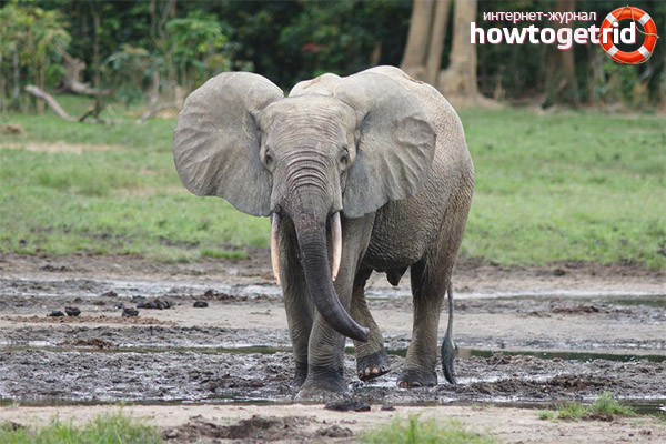 - Contrairement, par exemple, à leurs homologues de la savane, ces individus sont de taille moyenne et inférieurs à ceux similaires en termes de caractéristiques de taille. Ils poussent le long du garrot jusqu'à environ un mètre et demi, ce qui est très petit pour ces animaux. Dans le même temps, les représentants africains atteignent près de 4 mètres. La catégorie de poids varie entre 2,6 et 6 tonnes.