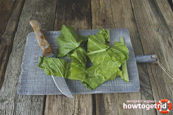 Le matin, vous devez retirer la compresse, et sur la zone de la peau en dessous, du sel blanc sera perceptible, c'est l'excès de sel du corps. Seul le raifort est capable d'attirer les sels corporels à travers les pores de la peau. Il doit être enlevé avec un chiffon humide, puis appliquer une crème hydratante sur la peau pour éviter le dessèchement et les tensions. Pour obtenir un résultat durable, une compresse doit être appliquée dans les 7 à 8 jours, pour une compresse 2 à 3 feuilles de taille moyenne sont nécessaires.