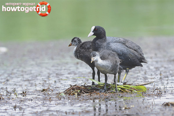 Lors de la construction du nid, ce dernier est fixé par les oiseaux sur l'eau à travers le système racinaire des plantes sous-marines. Ceci est fait pour que le courant n'enlève pas le nichoir. En règle générale, le diamètre d'un tel bâtiment atteint 35-45 cm, la profondeur est d'au moins 20-25 cm et la distance entre les nids de foulques est d'au moins 30-50 mètres.