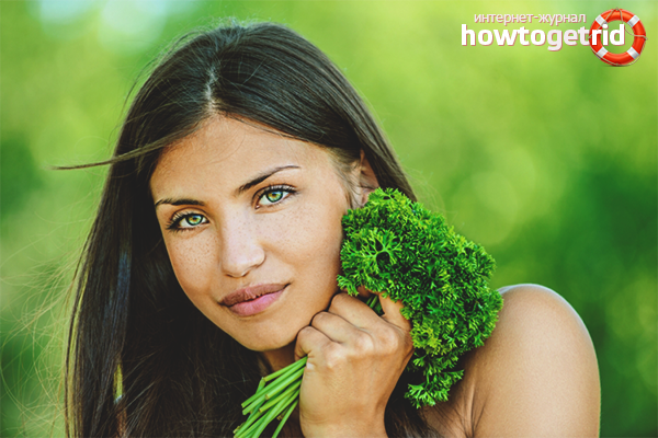 Les masques au persil sont très populaires chez les personnes avec des taches de vieillesse et des taches de rousseur. Pour vous débarrasser de ces fonctionnalités, appliquez le produit 1 fois par semaine. À des fins de prévention, préparez des formulations trois fois par mois.