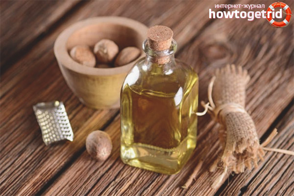 - Compresses: L'huile de muscade (5 gouttes) est combinée avec la base (10 ml), chauffée, appliquée sur la zone lésée.