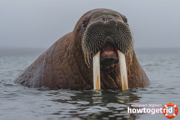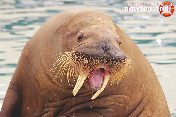 - Si vous regardez ces pinnipèdes, vous remarquerez immédiatement la taille impressionnante des crocs. Ils sont situés sur la mâchoire supérieure et tombent. Chez certains individus, la taille des défenses atteint parfois 70 cm, ce qui est nécessaire pour se protéger contre les ennemis des morses en milieu naturel. Ces crocs contribuent également à l'extraction pratique des aliments par le bas. Un autre aspect - quand un morse grimpe sur la glace, il le fait à l'aide de défenses, s'accrochant à eux comme des chats avec des griffes derrière un arbre.