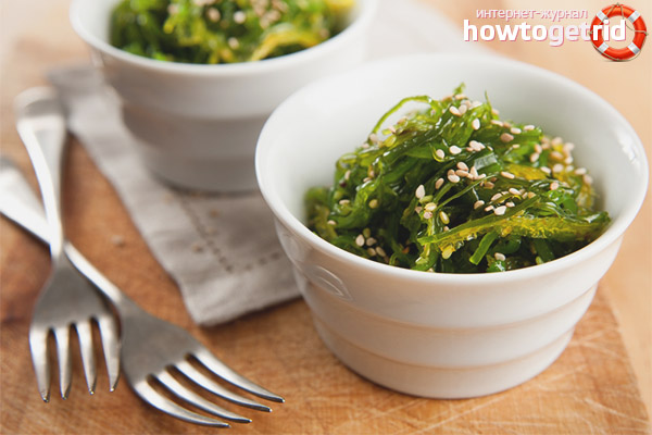- Traitement. Le plus grand avantage est concentré dans le varech frais. Mais vous pouvez l'utiliser sous forme séchée. Pour ce faire, il est pré-rempli d'eau bouillante. Au fil du temps, le chou gonfle et peut être consommé en toute sécurité. À partir d'un tel produit, diverses salades sont savoureuses.