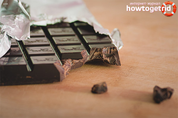 - Il est recommandé de manger du chocolat pour les personnes atteintes de cette maladie au cours d'une vie active. Cela se réfère au sport, immédiatement après l'entraînement, une sensation de fatigue apparaît, il a tendance à dormir. Pour restaurer la force, il est recommandé de manger quelques cubes de chocolat après 1,5 heure après le cours. Cela augmentera l'efficacité, prolongera la sensation de satiété.