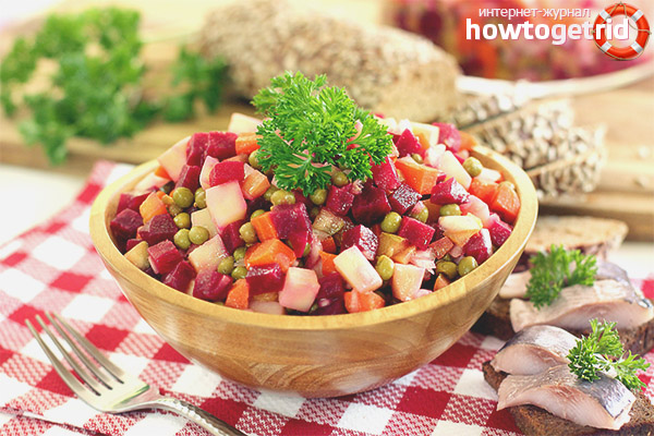 Ensemble, tous les légumes sont un bon fournisseur de glucides pour le corps, qui lui fournit suffisamment d'énergie. Certaines femmes n'ajoutent pas du tout de sel à la vinaigrette. Ils considèrent que la présence de cornichons et de choucroute est tout à fait suffisante. Avec la lactation, l'absence de poivre dans ce plat sera également plus rationnelle.