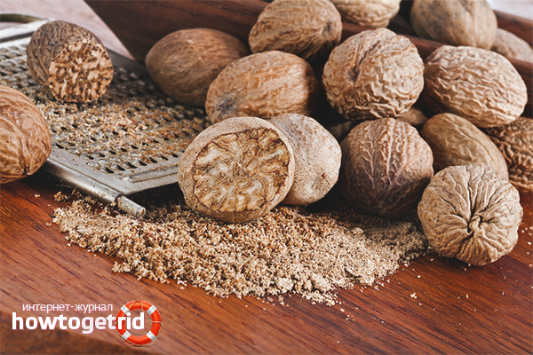 - Prenez un verre standard (250-300 ml.) Versez 6 g. muscade moulue, versez de l'eau tiède. Mélanger les composants, boire 1 gorgée pendant la journée.