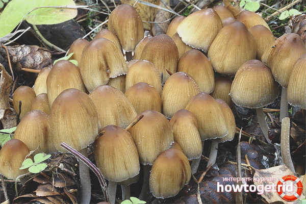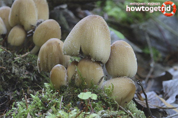 - Copépodes Coprinus. Ce champignon ne doit pas être mangé. Le chapeau a une forme fusiforme, mais le lendemain prend la forme d'une cloche. Et après un certain temps, il devient presque plat. Même au stade de la forme de la cloche, le chapeau commence à se décomposer. Des flocons blancs de petite taille sont visibles en surface. La pulpe du champignon est fragile, la jambe est généralement incurvée et présente des écailles. La période de fructification commence en été et dure jusqu'à l'automne. Le champignon pousse sur les arbres en décomposition ou dans un pâturage où le sol est fertilisé avec du fumier. Le corps du champignon se développe rapidement et s'estompe.