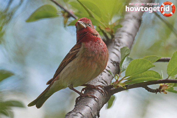 Au total, il existe 4 sous-espèces de cet oiseau, chacune a de légères différences d'aspect et de couleur, mais en termes généraux, elles sont similaires. En taille, les lentilles répètent complètement les paramètres d'un tweeter urbain - longueur - jusqu'à 20 cm, poids - 80 grammes, envergure - 9 centimètres. Seulement deux différences - un bec jaune épais et légèrement gonflé et une couleur rose vif de mâles, à partir de laquelle vous pouvez déterminer immédiatement le type d'oiseau. Le plumage est presque entièrement rose-rouge, en particulier dans la poitrine et le goitre. Seul le torse inférieur est blanc rosâtre et le sous-caudale avec l'aisselle est blanc immaculé. Sur le bas du dos et le bas du cou, les plumes rouge foncé sont décorées d'une bordure claire.