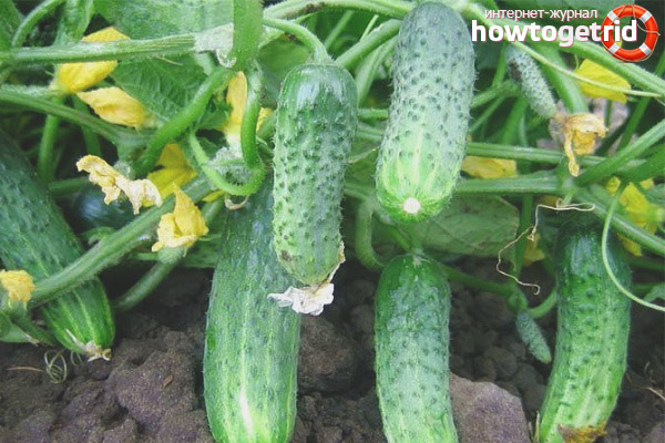 Buissons de ramification moyenne, a un type de floraison femelle. Jusqu'à 3 feuilles vertes sont formées dans un nœud. Les feuilles sont vertes, de taille moyenne. Les premiers concombres apparaissent environ 2 mois après l'émergence. La variété est dotée d'une excellente résistance aux maladies courantes - l'oïdium et les taches d'olive. Les inflorescences sont formées par un type de grappe, c'est-à-dire des grappes. Dans chaque faisceau, jusqu'à 3 ovaires se forment.