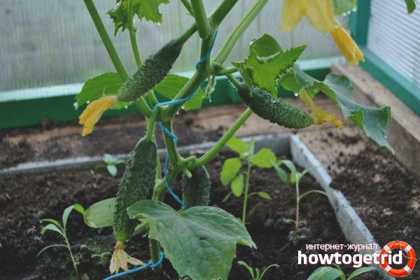 Après la plantation, les puits avec les plantations doivent être recouverts d'un film ou de polyéthylène.Afin de faciliter l'entretien des plantes et d'augmenter le rendement, il est recommandé de lier les cils des concombres à un treillis vertical.