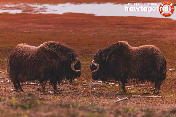 Les plus gros spécimens se trouvent dans l'ouest du Groenland, et le plus petit - dans le nord. Le bœuf musqué ne ressemble pas à un yack ou un bison, par exemple, non seulement à l'extérieur, leur ensemble diploïde de chromosomes varie également: le bœuf musqué a 48 paires de chromosomes, et le bison et le yak en ont 60 paires.