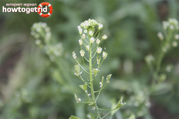 Capsella bursa pastoris - c'est le nom de la bourse du berger en latin. Et donc il n'a pas été baptisé. Les fruits en forme ressemblent vraiment à un sac de berger. L'herbe fait référence aux plantes crucifères annuelles. La tige est droite et ramifiée, atteignant une hauteur de 60 cm et son sommet est l'emplacement des inflorescences. Les fleurs sont blanches et contiennent 4 pétales. Toutes les parties de la plante, à l'exception de la racine, sont utilisées à des fins médicinales.