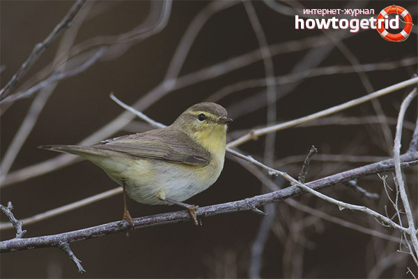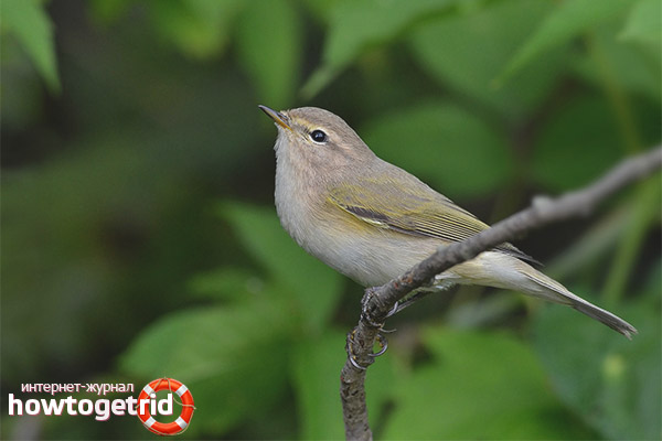 - Bourre de plumes. Il s'agit d'un oiseau de taille moyenne dont la longueur du corps atteint près de 14 cm et ses ailes ont une envergure de 21 cm.L'apparence est similaire à une tenochka, mais ces oiseaux chantent de différentes manières. Le haut du mollet a une couleur verte, plus proche de la teinte olive, l'abdomen est clair avec une teinte jaunâtre. Le jaune est également présent sur la poitrine, sur la gorge et dans les rayures près des yeux de l'oiseau. Le poids d'un tel bâton est d'environ 10 g. Vit en Europe, mais vole pour l'hiver en Afrique.
