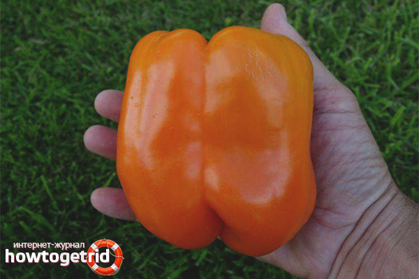 Le buisson est compact, bas, la taille varie de 50 à 70 cm Il y a peu de feuilles, elles sont uniformément réparties, les inférieures jaunissent et tombent avec le temps. Sur 1 plante, jusqu'à 6 à 12 fruits sont liés. Leur taille est d'environ 175-200 gr. Le zeste est mince mais résistant, de sorte que le poivron conserve sa fraîcheur pendant une longue période de stockage et transfère facilement le transport sur de longues distances sans perte de goût et de présentation. A l'intérieur, les fruits sont divisés en 3 ou 4 chambres, peu de graines. Étant donné qu'il s'agit d'une variété hybride, il est inutile de collecter des graines pour l'année suivante, car lors de la replantation: