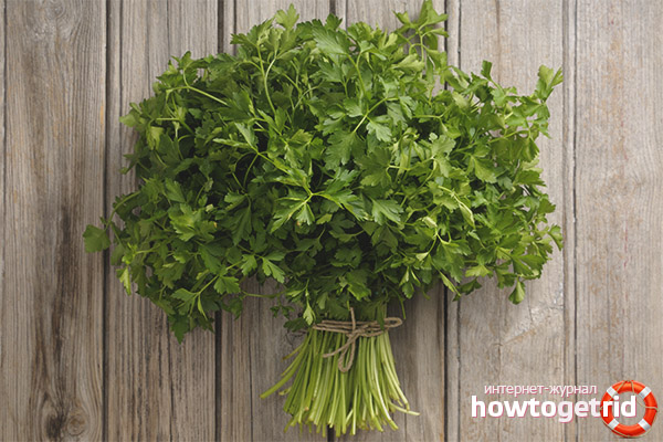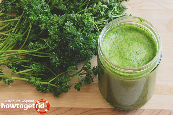 - Décoction de persil. 2 cuillères à soupe légumes verts hachés versez 250 ml d'eau tiède et faites bouillir pendant 15 minutes. Le bouillon est bu pour une guérison intensive dans un cours de trois jours, 1 verre par jour avec les repas.