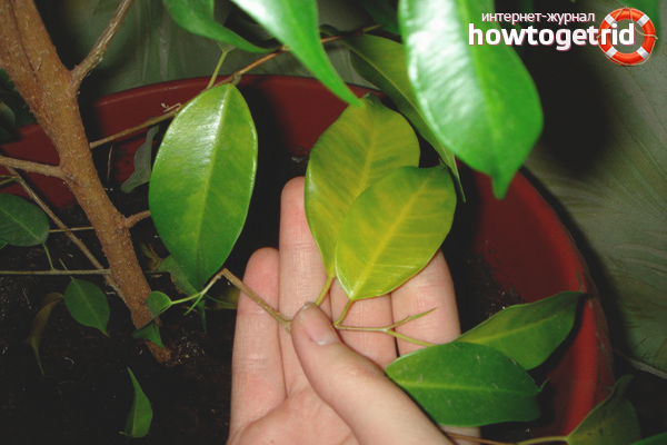 Bien sûr, nous ne prendrons pas en compte les processus naturels du vieillissement. La perte de plusieurs feuilles jaunes à l'automne ou en hiver est tout à fait normale. Nous analyserons le jaunissement de masse et le ficus feuillu le plus fort.