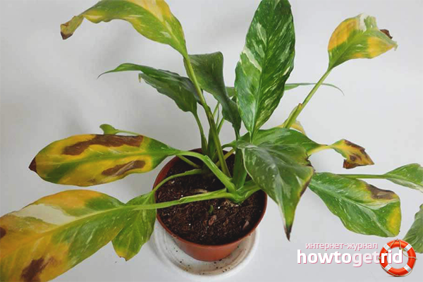 Prenons un exemple. Les producteurs précisent pourquoi les feuilles de spathiphyllum jaunissent. Que faire Ils demandent. Cette plante est si sans prétention qu'il faut essayer très fort de la ruiner et de la faire jaunir. En d'autres termes, quel type d'hôte êtes-vous, même si votre spathiphyllum est malade? Nous allons maintenant analyser toutes les raisons possibles.