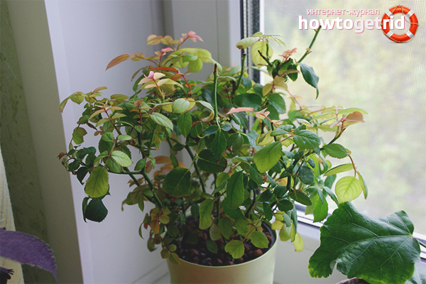 Cette cause de jaunissement des feuilles dans une rose de chambre est souvent confondue avec un manque d'azote. De même, les limbes foliaires changent complètement de pigmentation, en commençant par les plus anciens et les plus bas. Le processus s'accélère progressivement, les feuilles volent, puis la fleur meurt.