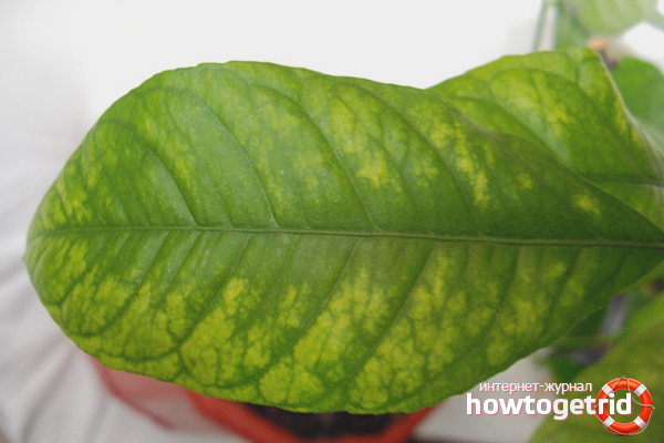 Signes De petits trous apparaissent sur les feuilles, qui avec le temps augmentent de taille et jaunissent. Sur la face inférieure de la plaque, vous pouvez remarquer des insectes ou des écailles brillantes - ce sont aussi des parasites.