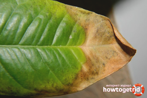 Signes D'abord, les pointes des feuilles jaunissent, puis sèchent. De plus, le jaunissement s'étend à toute la plaque de tôle, il pâlit, sèche et tombe.