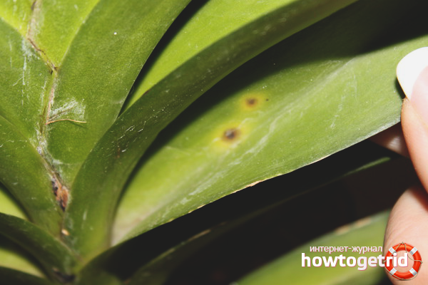 Signes Inspectez les orchidées. Vous trouverez certainement des invités non invités. Surtout sur la face inférieure des feuilles jaunies.