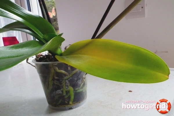 Signes Les feuilles inférieures jaunissent. Les racines d'orchidées deviennent molles, de couleur foncée. La plante est trop lâche dans le pot.