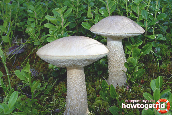 Bolets blancs - un autre champignon porcini très similaire aux bolets, diffère par la couleur de la pulpe nettement modifiée au point de rupture. Le cèpe blanc ou le tremble blanc est un champignon qui a une assez grande taille. Il se distingue également par la présence d'un chapeau charnu dont la circonférence atteint parfois 25 centimètres de diamètre. Le chapeau est peint en blanc, gris-blanc ou gris. La pulpe est forte, acquiert une teinte bleue ou verte au fond, à la fracture, elle est généralement bleuâtre et atteint parfois une couleur noire profonde. La jambe est haute, le bas est beaucoup plus épais que le haut. Il a une couleur blanche, sur toute la longueur, des écailles longitudinales ou blanches avec une teinte brunâtre sont nécessairement localisées.