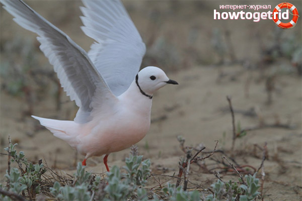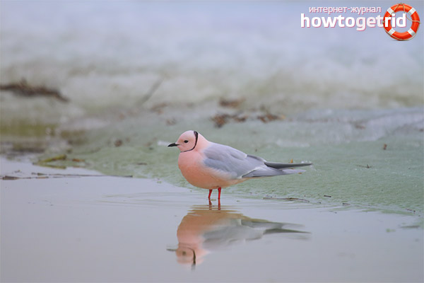 La principale caractéristique distinctive est la couleur rose sur l'abdomen et sur la poitrine, ainsi que la structure gracieuse du corps. En regardant une mouette en vol, on ne peut qu'être surpris de sa grâce et de sa beauté. L'oiseau plane sans faire de bruit, comme si cela ne lui posait aucune difficulté. Une autre caractéristique distinctive parmi les autres goélands est une voix haute. Elle peut faire une variété de sons si elle le souhaite. L'oiseau ne fait pas ces sons sans raison. De cette façon, les goélands roses communiquent entre eux. En criant, d'autres personnes comprennent que l'oiseau s'inquiète de quelque chose, ou, par exemple, en colère.