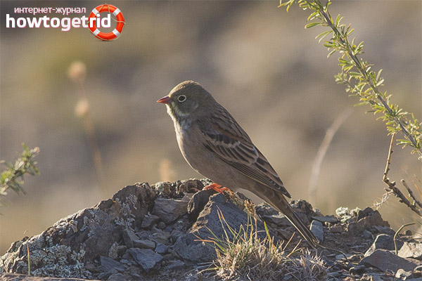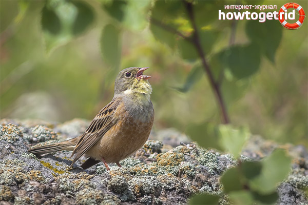 Le bruant est très compact. Vous pouvez les distinguer des autres oiseaux par leur couleur vive et leur voix. Autour des yeux de ces oiseaux, il y a des anneaux blanchâtres. En général, la tête est de couleur olive de la même manière que la zone de la poitrine. Le bec est rosâtre. Sur la tête, vous pouvez également distinguer des "antennes" jaunes particulières, qui se transforment en le même cou jaune. Le ventre de flocons d'avoine a une couleur marron.