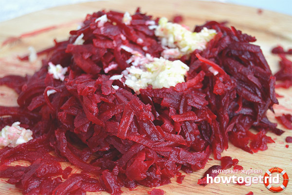 - Alors, faites bouillir quelques racines. Ensuite, laissez-les refroidir, retirez la peau. Passer à travers une râpe à gros trous. Commencez ensuite la cuisson de la vinaigrette en combinant des gousses d'ail hachées (2 pièces suffisent) avec 100 gr. crème sure ou mayonnaise.
