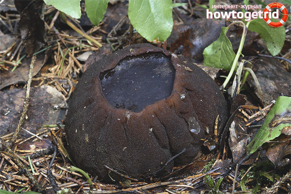 Extérieurement, le sarcosome sphérique est très similaire à un petit baril à ventre en pot avec un cou rempli d'un liquide clair et léger. Il ressemble à un héros de conte de fées de la forêt magique. La couleur du fruit est souvent brune ou brun foncé, mais le fond est toujours plus foncé.