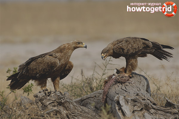 L'aigle des steppes ne craint pas de manger des charognes, surtout s'il y a une forte baisse du nombre de lièvres ou d'écureuils terrestres. Souvent, vous pouvez voir à quelle distance de la carcasse d'un animal tombé, sans conflits internes, jusqu'à 10 prédateurs se nourrissent en même temps.