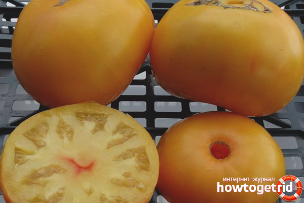 Le baiser de Tomates Grand-mère plaira avec des fruits jaunes ronds nets. Ils sont bons à la fois pour manger et en conserve pour l'hiver, le traitement des pâtes, du jus, du ketchup. La maturation de la récolte est ondulée.