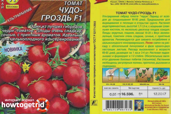 La variété de tomate à petits fruits est toujours intéressée par les jardiniers invétérés. Ils ont un excellent goût, faciles à entretenir et sont faciles à conserver entiers. Ces ébauches décoreront toujours n'importe quelle table de fête. Les tomates Miracle bunch F1 sont inscrites au registre national en 2012. La variété est destinée à la culture en plein air et en terrain clos. Désigne les hybrides à maturation ultra-précoce. La période de fructification commence 90 à 95 jours après l'apparition des germes.