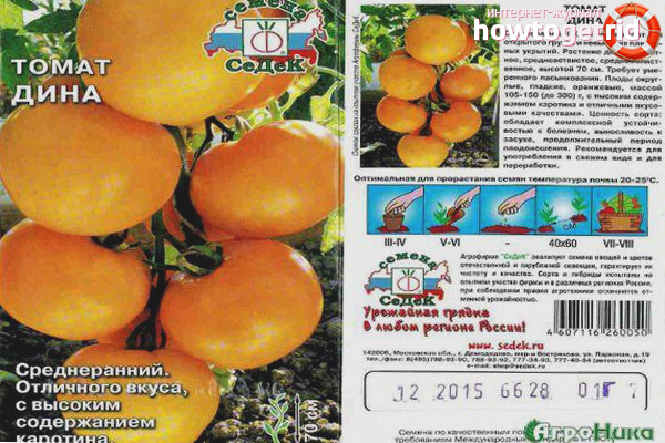 L'avantage de la variété Dina est la charnue des fruits et la présence d'une quantité insignifiante de graines. La tomate est idéale pour faire des salades. La tomate peut être cultivée avec succès en pleine terre, mais la culture en serre est préférable.