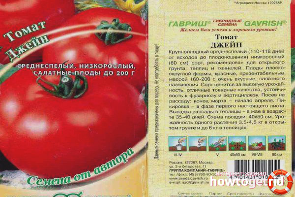 Le poids de la récolte d'un buisson est de 4 kilogrammes (lit ouvert) ou 6 kilogrammes (serre, serre). Le poids d'une tomate atteint parfois 190 grammes. Aigre, mais cela ne gâche en rien l'excellent goût de Jane. Les tomates sont bien adaptées à la consommation crue. La pulpe du légume est rouge foncé et charnue. La peau est dense.